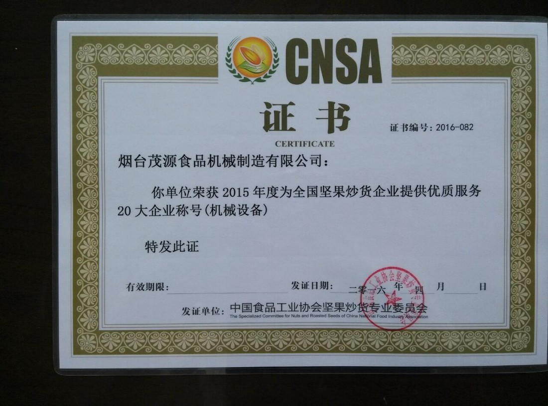 展會期間,主辦單位還舉辦了全國堅果炒貨行業(yè)國內(nèi)外新設(shè)備(包裝)、新技術(shù)、新型添加劑、配料等新產(chǎn)品推廣發(fā)布會,發(fā)布了2015-2016年全國堅果炒貨行業(yè)新設(shè)備和新型添加劑的使用分析和預測報告,還有9家中外企業(yè)的11項新設(shè)備(包裝)、新技術(shù)、新型添加劑進行了推介發(fā)布。煙臺茂源食品機械制造有限公司作為9家中外企業(yè)之一在這次大會上了做了新設(shè)備的推介發(fā)布,并和現(xiàn)場業(yè)內(nèi)同行進行提問互動。會后,舉辦了2015年度全國堅果行業(yè)優(yōu)秀企業(yè)的頒獎典禮,煙臺茂源等20個企業(yè)被評為2015年度為全國堅果炒貨企業(yè)提供優(yōu)良服務企業(yè)稱號。