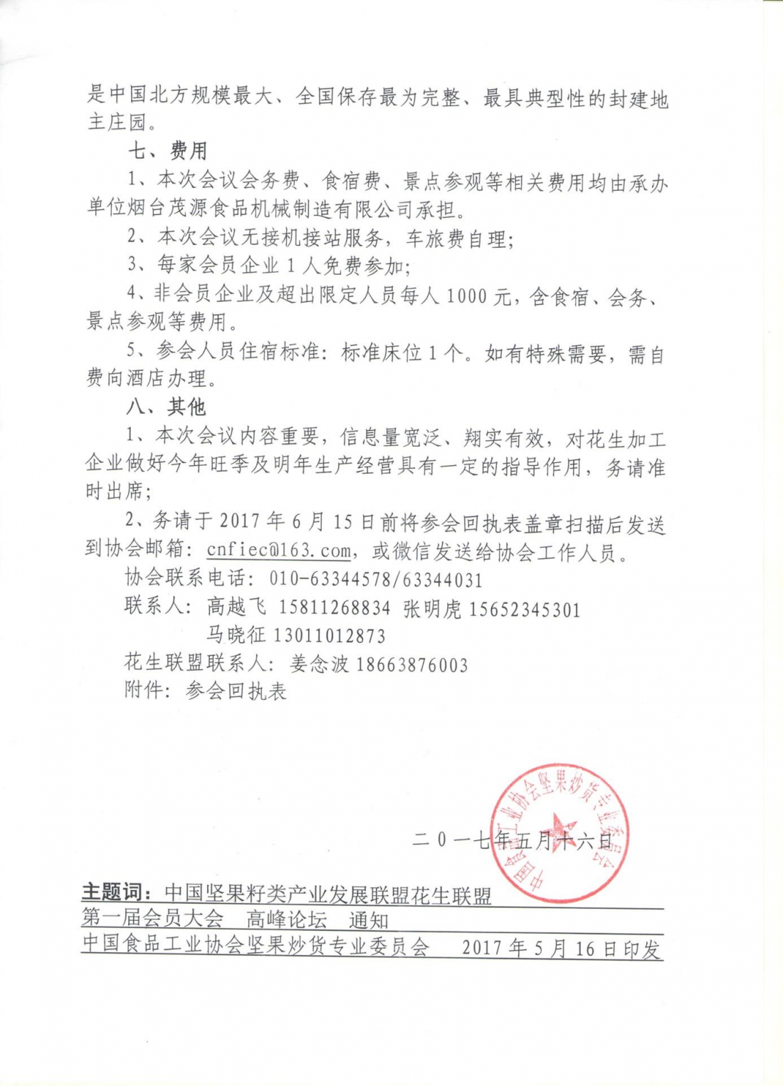 | 其他事項 | 1、請各參會代表務必將回執表的每一項填寫齊全,于2017年6月15日前,蓋章掃描后發送到郵箱:cnfiec@163.com,或微信發送給工作人員,以便做好各項準備工作; 2、協會電話:010-63344578/63344031 聯系人:高越飛 15811268834馬曉征13011012873 花生聯盟聯系人:姜念波18663876003 郵箱:myspjx@163.com | ||