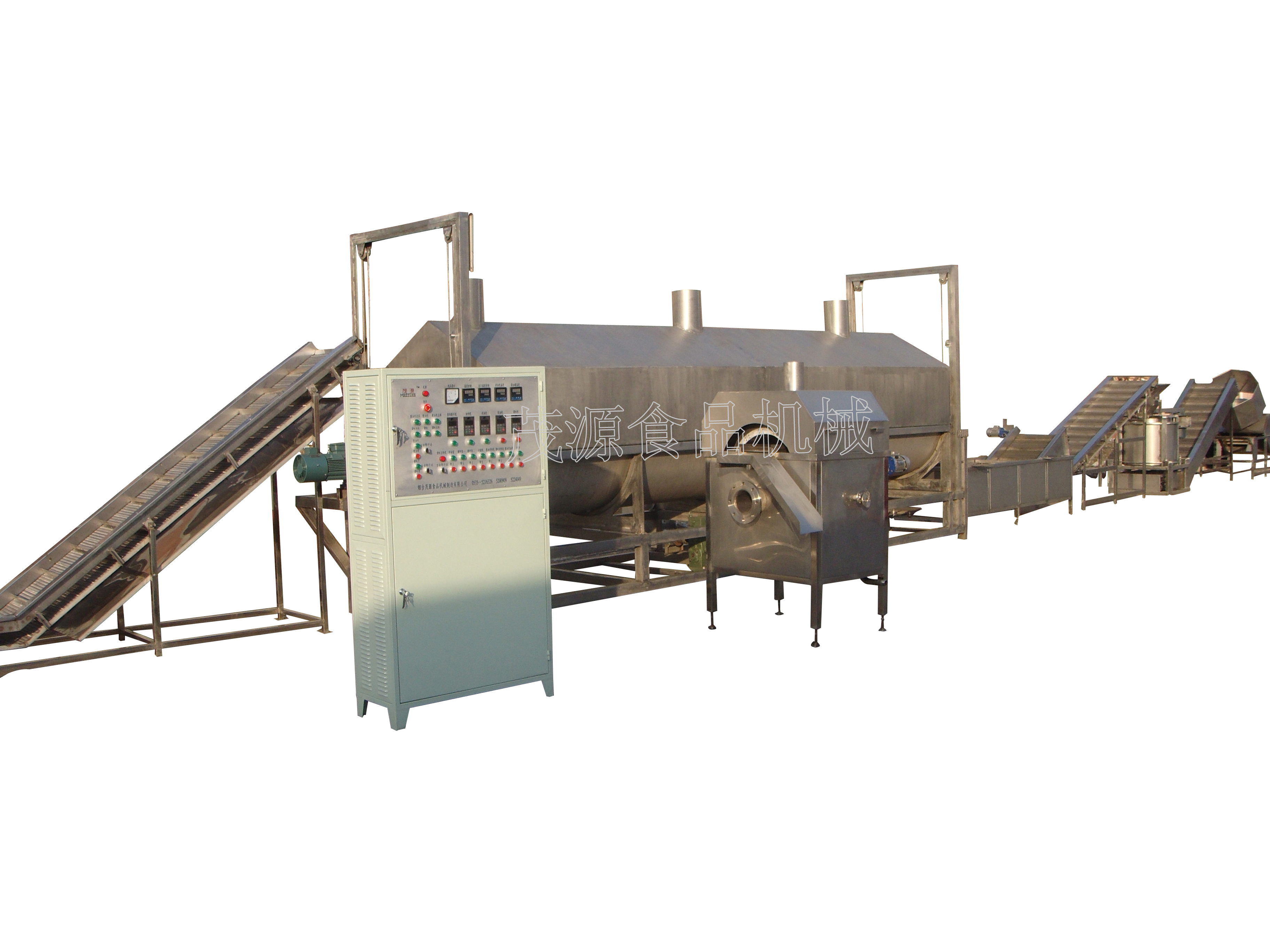 煙臺茂源食品機械制造有限公司制造的全自動連續油炸生產線選用進口不銹鋼精制而成,潔凈美觀,利用導熱油加熱。