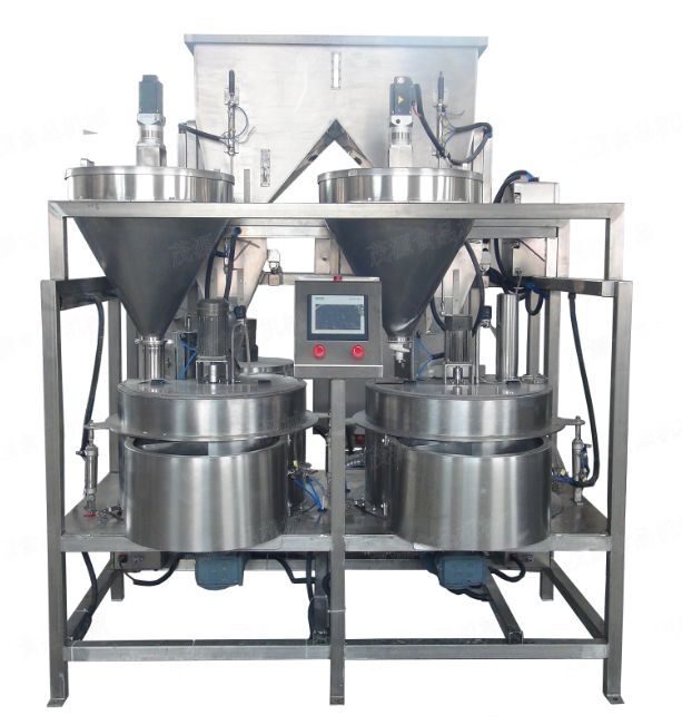 裹衣原料儲(chǔ)存在料斗中,由PLC控制自動(dòng)出料,通過稱重料斗自動(dòng)稱重,原料自動(dòng)投入到裹衣桶中,通過裹衣桶旋轉(zhuǎn)盤帶動(dòng)原料進(jìn)行運(yùn)轉(zhuǎn),料液通過容積泵和高速甩液盤將料液均勻涂灑到原料表面,粉料通過自動(dòng)定量給粉系統(tǒng)投入到裹衣桶中,實(shí)現(xiàn)一次裹粉作業(yè)過程,循環(huán)的次數(shù)取決于產(chǎn)品工藝參數(shù)要求,可設(shè)定不同裹衣次數(shù),以實(shí)現(xiàn)不同裹衣產(chǎn)品。全裹衣過程準(zhǔn)確控制每次投入的粉劑和料液,以便達(dá)到每次裹衣的一致性。