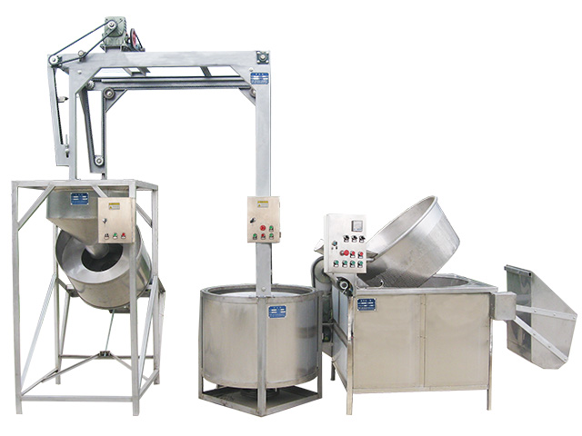 簡(jiǎn)易油炸生產(chǎn)線Ⅱ型由油炸機(jī)、脫油機(jī)、提升機(jī)和拌料機(jī)組成。其中各部分均可單獨(dú)作業(yè)的。炸機(jī)可以將進(jìn)入炸鍋的原料從定時(shí)炸制,提鍋淋油,提升倒入脫油筒脫油到輸送出去一氣合成。溫度、油炸時(shí)間、脫油時(shí)間全部由PC機(jī)自動(dòng)控制;炸制效果穩(wěn)定均勻性好,能有效地控制食品含油量。加工出的產(chǎn)品,香脆可口、味道純正,是生產(chǎn)油炸花生、蠶豆等堅(jiān)果類食品的設(shè)備。